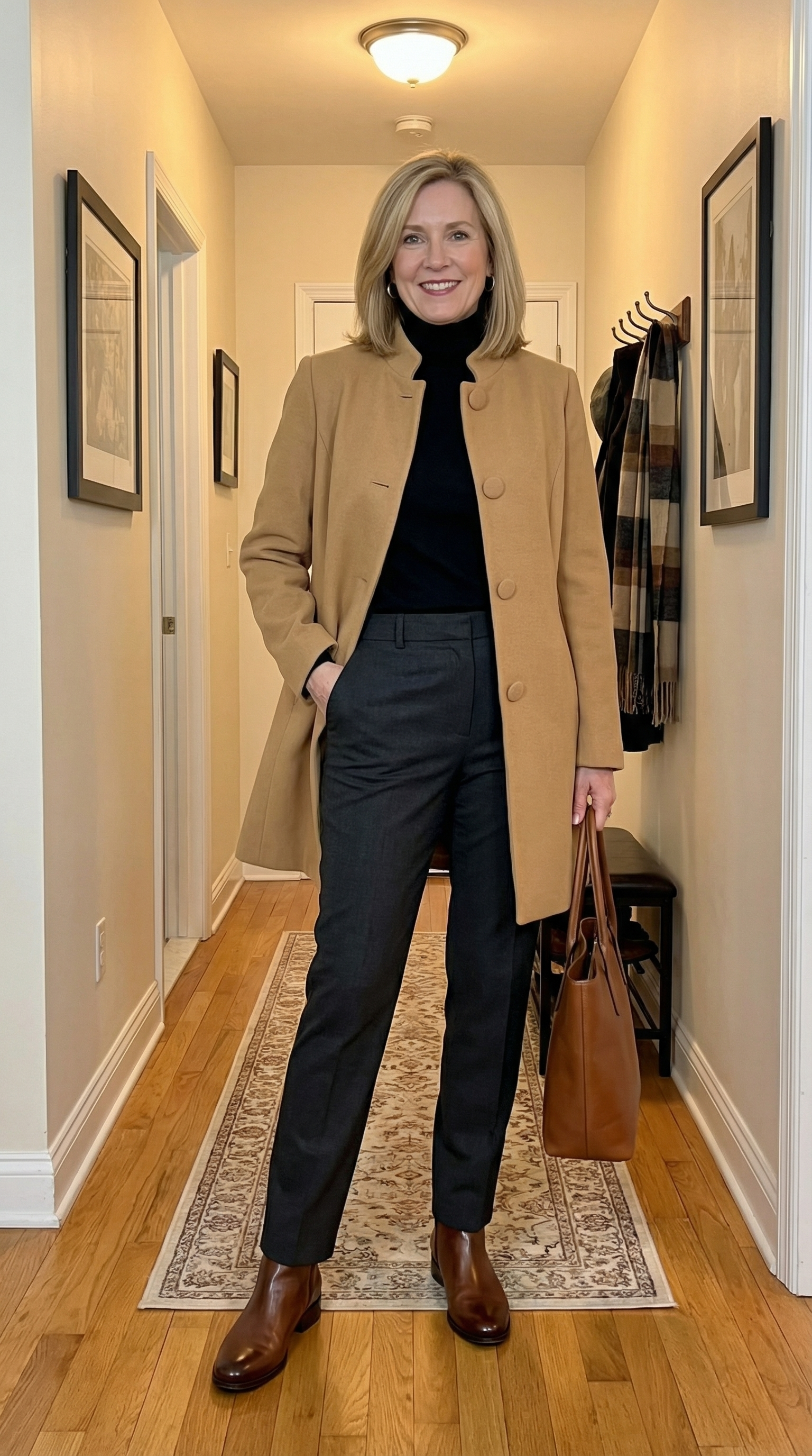 "The coat feels very elegant without being too formal. It's warm but still light enough to wear inside if needed. The fit is relaxed and comfortable, with enough room for a sweater underneath. I've already worn it several times and I'm so happy with it!"